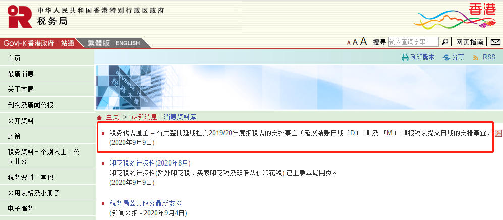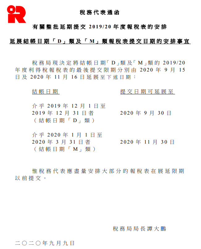 9月9日,香港稅務(wù)局發(fā)出關(guān)于《有關(guān)整批延期提交2019/20年度報稅表的安排》通知,稅務(wù)局決定延展結(jié)賬日期「D」類及「M」類報稅表提交期限,由最后提交期限的2020年9月15日改為2020年9月30日。