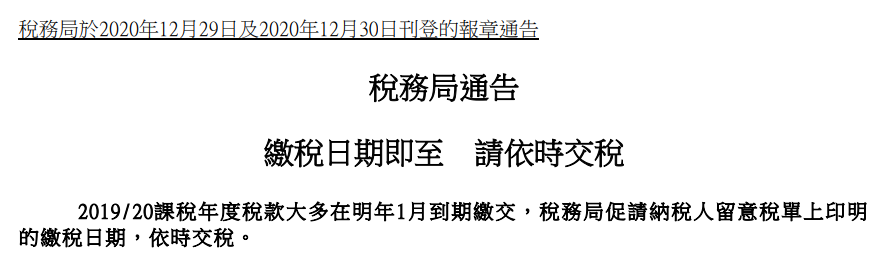 近期香港稅務(wù)局官網(wǎng)刊登了一則通告【繳稅期即至 請(qǐng)依時(shí)交稅】,2019/20課稅年度稅款在1月份即將到期繳納,提醒各納稅人留意稅單上的繳納日期,按時(shí)交稅。
