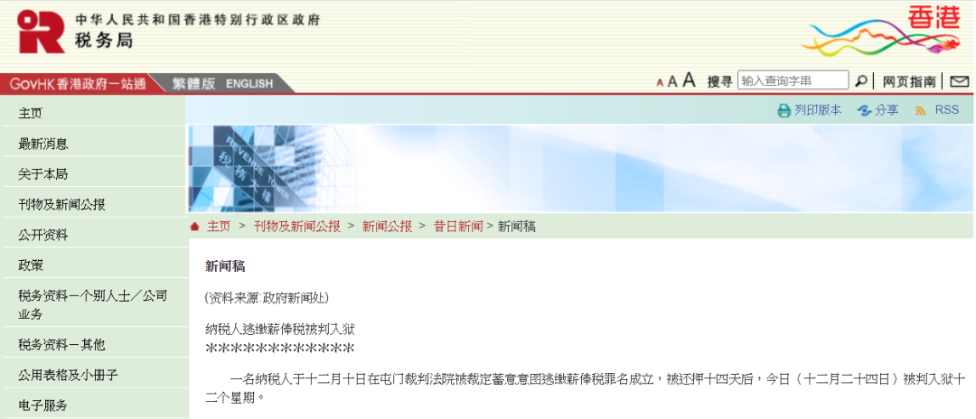 香港稅務(wù)局官網(wǎng),會(huì)定期公布的關(guān)于相應(yīng)逃稅違法行為的案例,這是最新的通告案例:12月24日,香港稅務(wù)局發(fā)布新聞公報(bào) “一名納稅人被法法院裁定蓄意意圖逃稅罪名成立”
