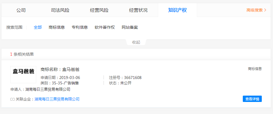 我們通過天眼查發(fā)現(xiàn),“盒馬夫人”、“盒馬爸爸”都是湖南每日三果貿易有限公司注冊,“盒馬兄弟”商標持有人是香港品牌集眾管理有限公司,“盒馬小姐”持有者是哈爾濱市香坊區(qū)盒馬小姐咖喱屋,目前該公司顯示已注銷。