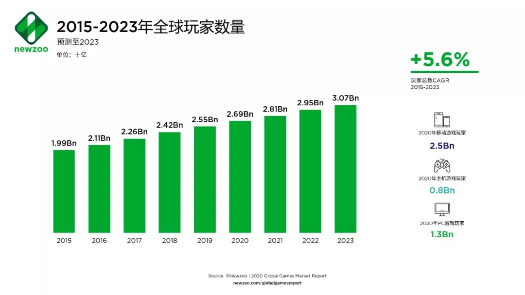 根據(jù)Newzoo最新發(fā)布的《2020年全球游戲市場(chǎng)報(bào)告》顯示,全球游戲市場(chǎng)規(guī)模將達(dá)1593億美元,同比增長9.3%;全球游戲玩家數(shù)量將持續(xù)增長,到2023年將超過30億。